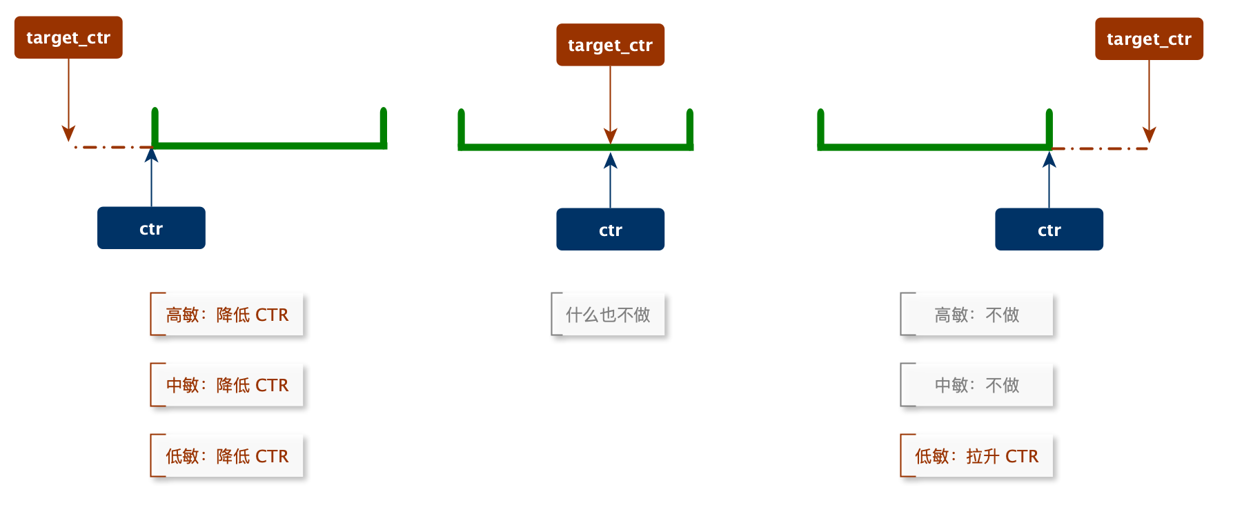 当实际 CTR 偏离目标 CTR 时,通过 **动态调整流量分布结构**,驱动整体 CTR 向目标值收敛。