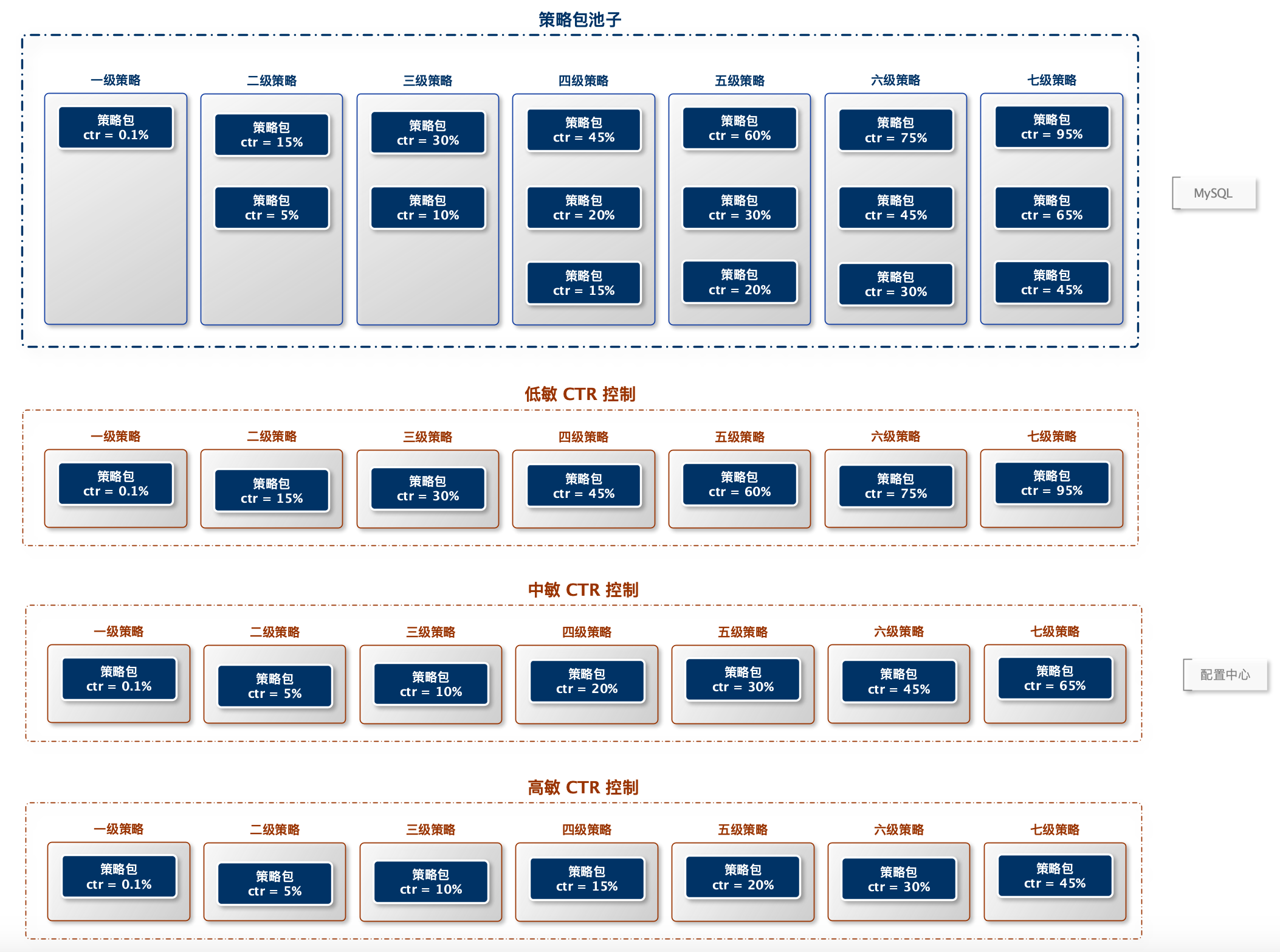 - 构建策略分层(如 CTR 分位:0.1% → 95%)